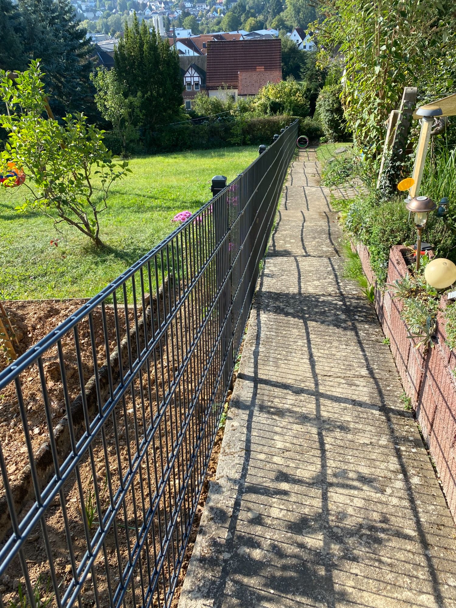Doppelstabmattenzaun der Stärke 8/6/8 in Anthrazit. Der Zaun wurde dem Gelände angepasst. Das Türchen ist eine Sonderanfertigung.